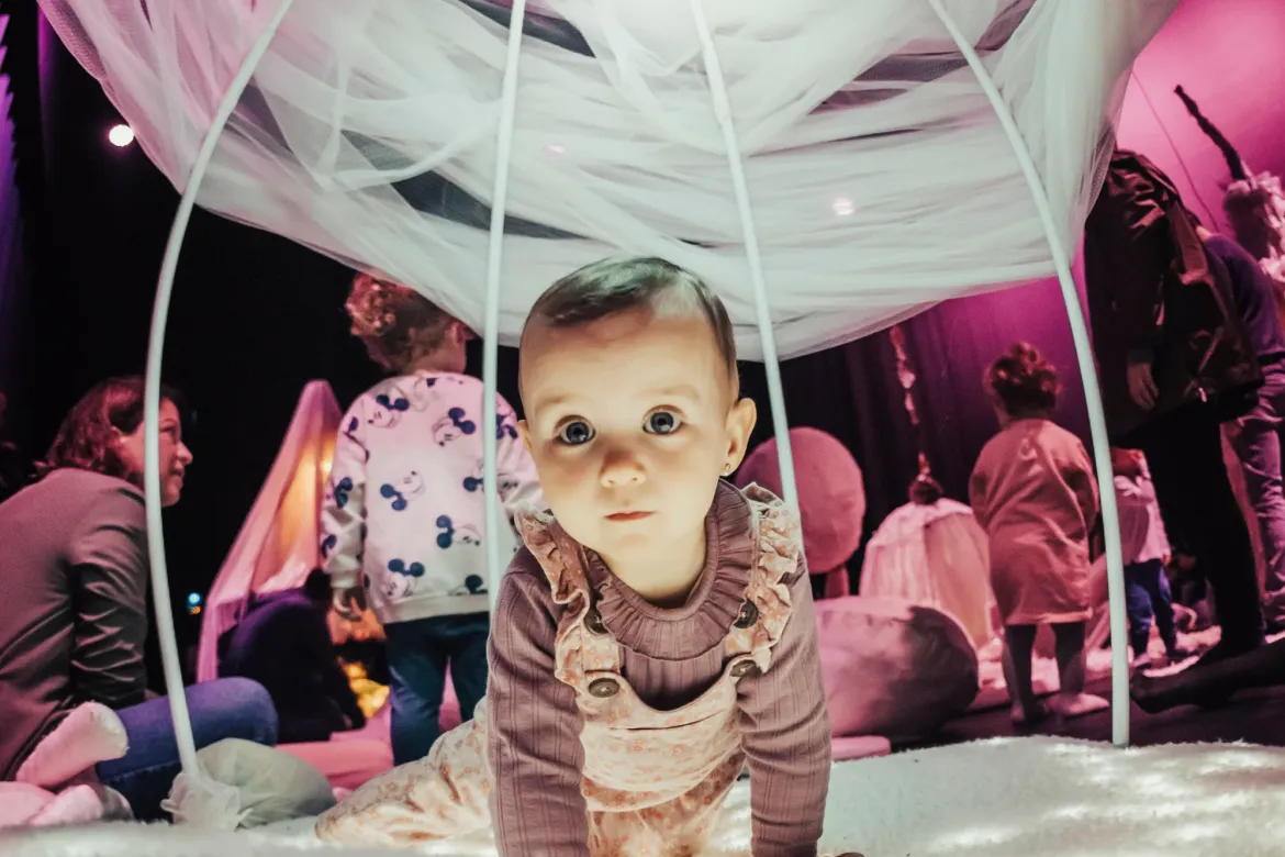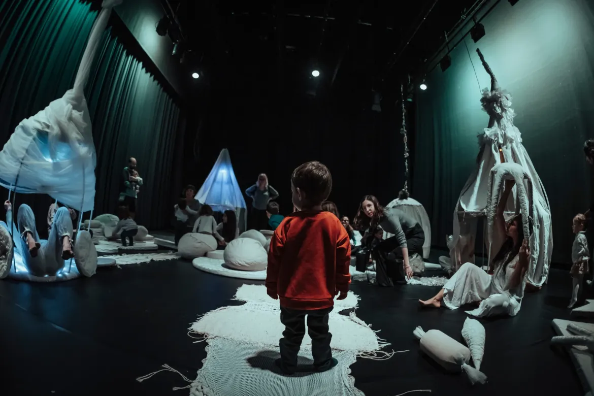 Una instal·lació per a descobrir, imaginar i somiar. Un petit poble format per caus de roba i teixits sorprenents, semblen construïts com ho fan els animals en plena natura, amb materials de diferents textures i olors. Un lloc on amagar-se i, des de dins, observar el món. Camins que ens porten a casa dels altres, on trobarem diferents colors, músiques i sorolls estranys. Coixins que parlen, que ronquen, que riuen i canten. Un espai per explorar en família, per relaxar-nos i gaudir plegats de la confortabilitat del propi cau.