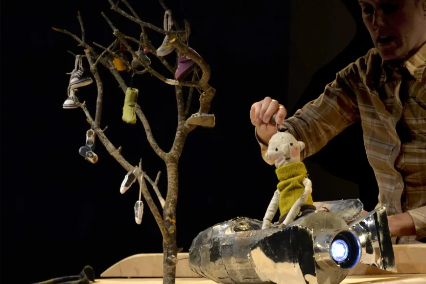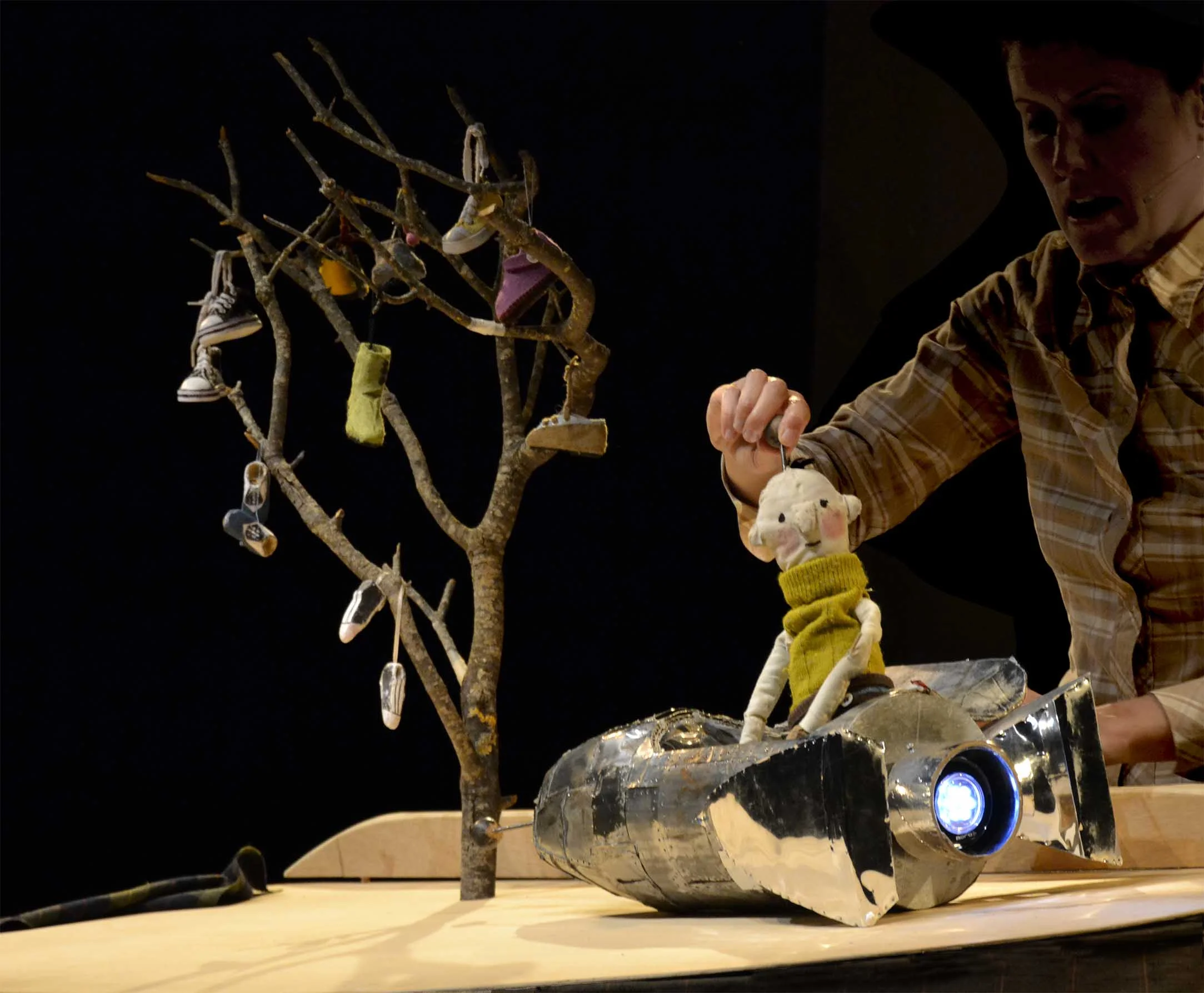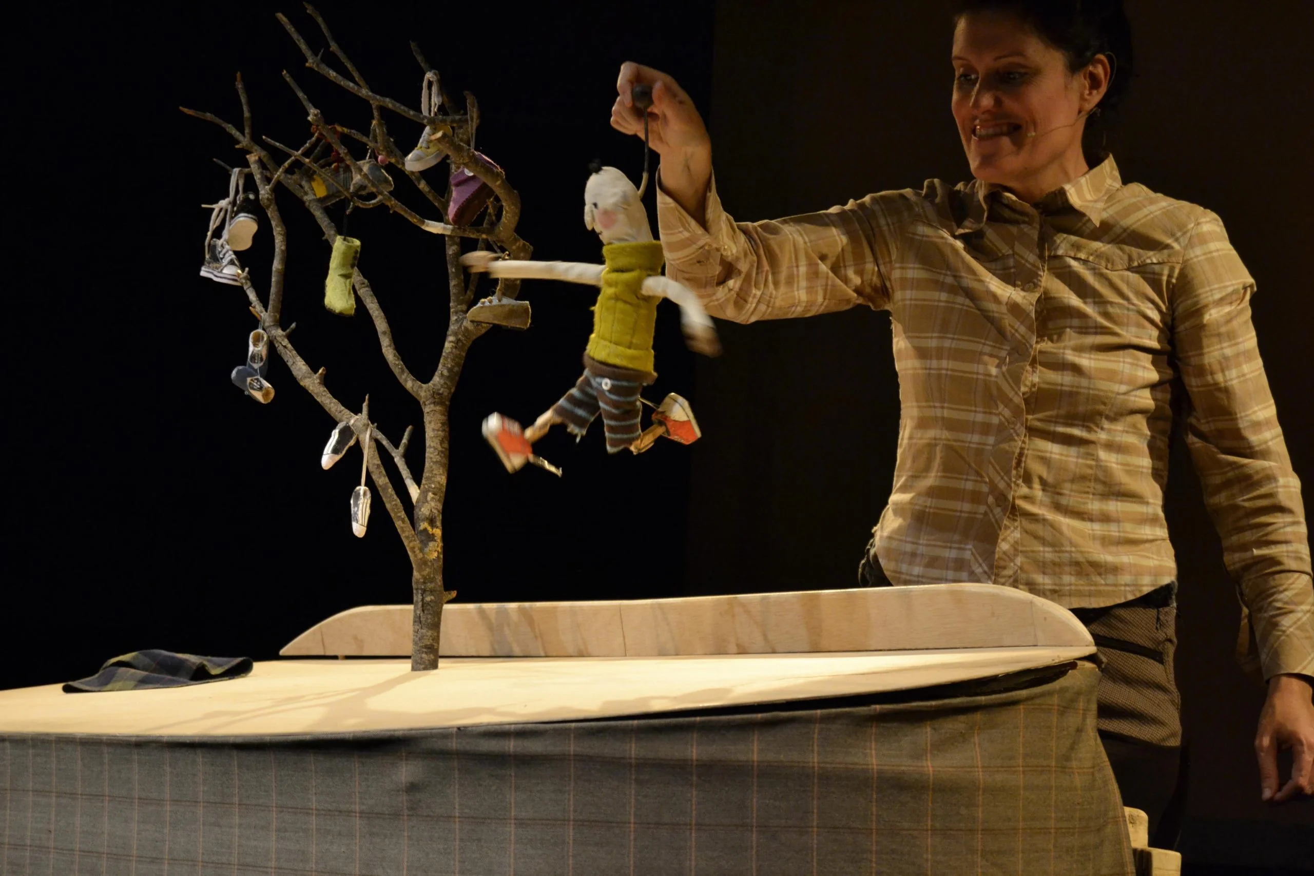 "L’arbre de les sabates" ens explica la història d’en Tim, un nen que ha perdut una de les seves sabates i no la troba enlloc. El senyor Gris, l’avi d’en Tim, li diu que segurament la trobarà en un arbre molt especial i en Tim, gairebé sense pensar-s’ho, iniciarà un viatge per tal de trobar la seva sabata perduda. En aquesta aventura es trobarà diversos personatges que l’ajudaran per avançar en el seu trajecte. Aprendrà dels animals i de les coses i al final… bé, el final no us el descobrirem. El que sí que us podem revelar és que amb Pea Green Boat sentireu música i cançons, veureu ombres xineses, gaudireu d’una escenografia delicada feta de fustes i de teles i us enamorareu de la curiositat d’un personatge que buscant una sabata trobarà el seu somni.