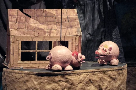 Teatre Arbolé, amb el seu segell característic d'humor, música i joc desenfadat, presenta una versió amb titelles de taula i fils que dona vida als tres poquets: Tocinete, el més gran, sempre disposat a posar-se a la feina; Gorrinico, el mitjà, un golut que només pensa en el seu quart berenar; i Cochinillo, el petit, un dormilega al qual li agrada jugar a fet i amagar. Però després d'una còmoda vida a la granja, com serà quan es trobin amb el llop?En realitat… saben el que és un llop?